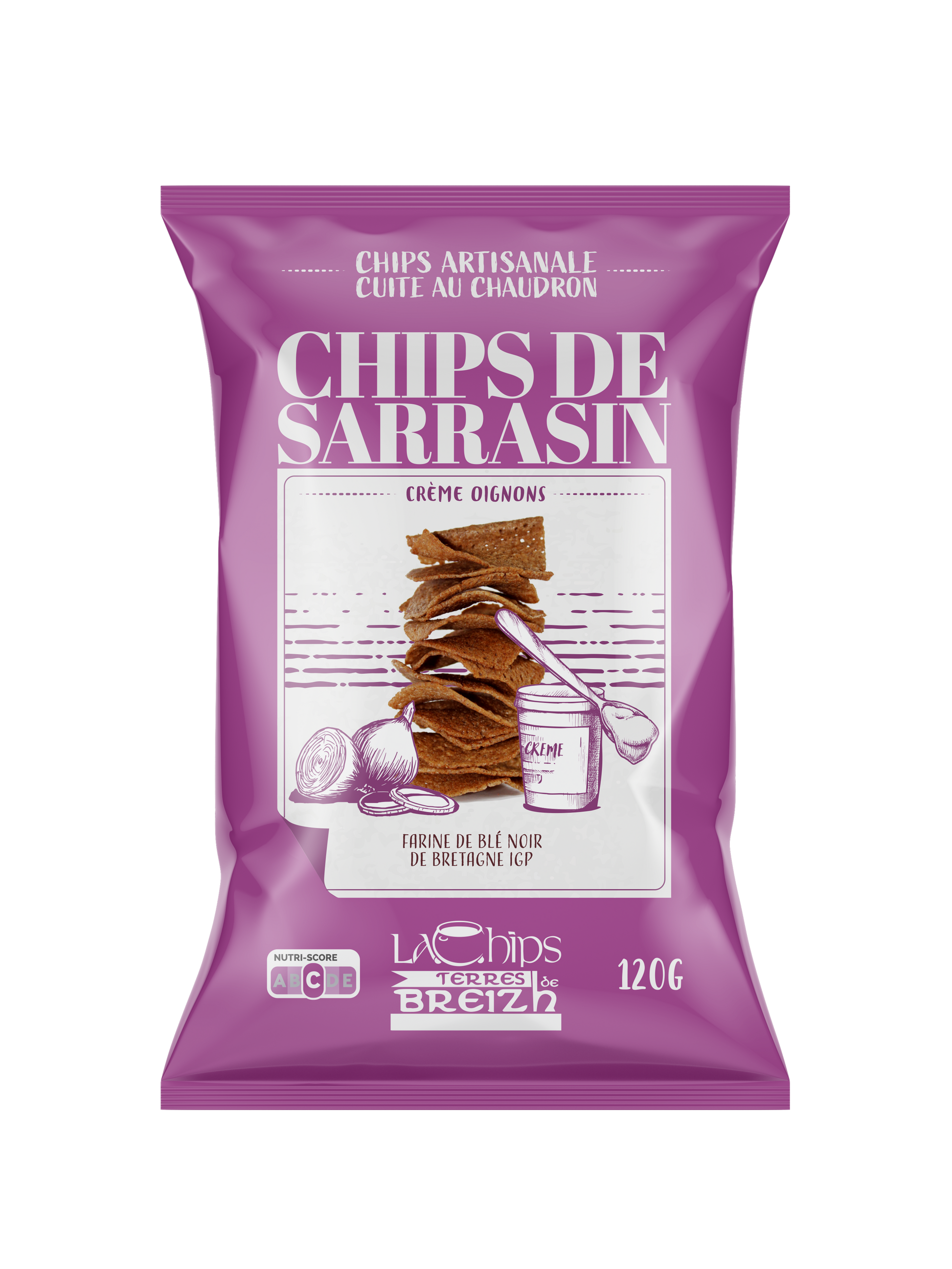 Chips de sarrasin au blé noir de Bretagne IGP cuites à l'huile de tournesol, aux oignons de Roscoff, à la crème et au sel de Guérande.